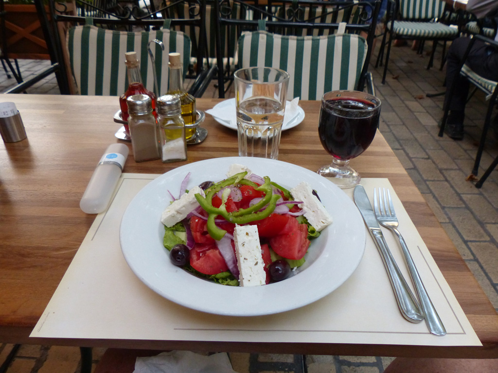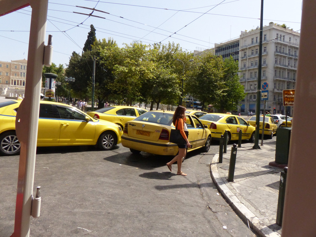 I’m not sure, but I may have seen the beginnings of a demonstration at Syntagma Square around noon. A cameraman with an old fashioned 16mm camera showed up about the same time as a hundred or so senior citizens marching down the street. At the same time a bunch of taxis showed up and started double parking and blocking intersections. Motorcycle police showed up and started making the cabs move on. No signs, though. Who knows? Greece will be