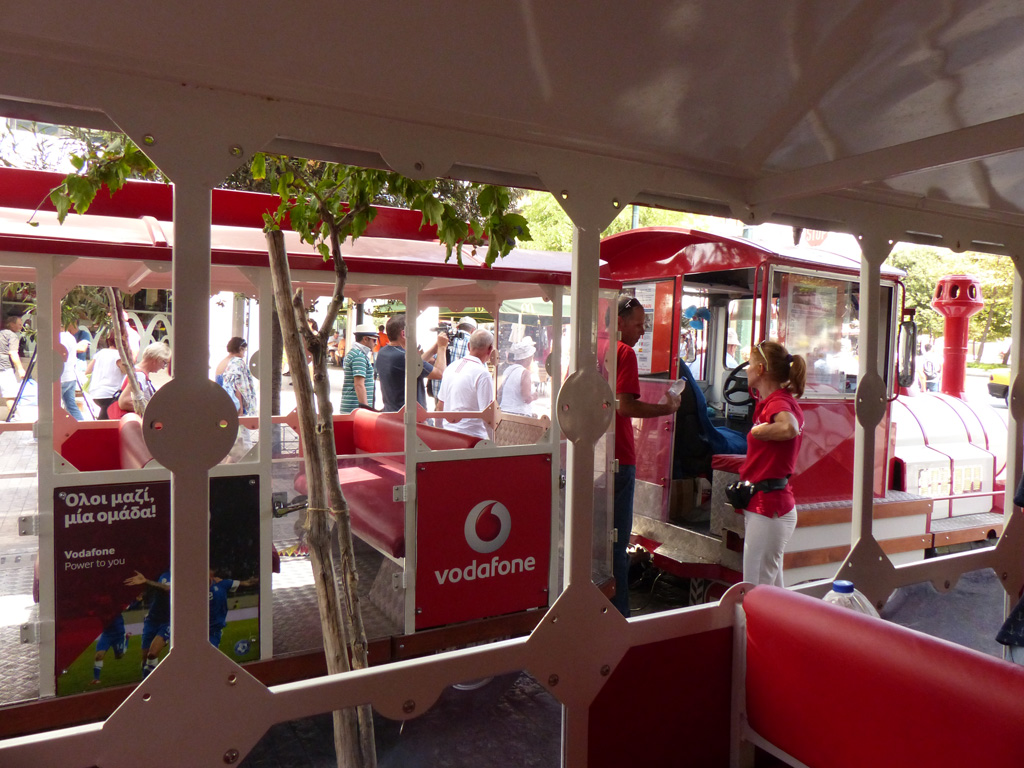 There was a hot time in old Athens today. The high was 108°F! That is 10 degrees hotter than Dallas. I didn’t do much other than ride around on a sightseer bus and train. (Not a real train). There are a lot places boarded up, but then it was Sunday and a lot of businesses may be closed for the day; certainly that is the case for the banks. Of course, all the tourist places were open for business. You could buy anything from fur coats (I can’t imagine they were doing a brisk business) to Orthodox church furnishings and vestment, to sandals, to ‘oriental’ rugs, musical instruments, pottery, statutes, paintings and jewelry.
